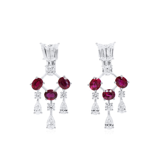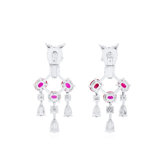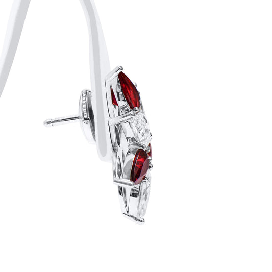Natural Diamond and Vivid Red Ruby Chandelier Earrings 18K White Gold, Pear Shape, 9.51 Ct. TW