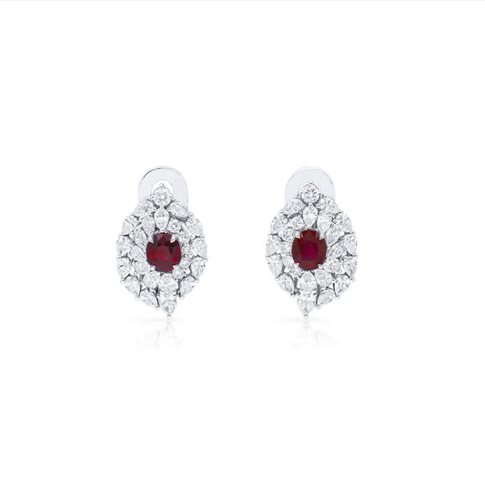 Natural Diamond and Vivid Red Burmese Ruby Hoop Earrings 18K White Gold, Oval Shape, 5.01 Ct. TW