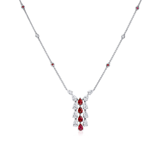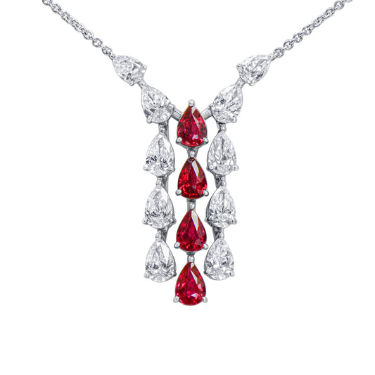 Natural Diamond and Red Ruby Necklace 18K White Gold, Pear Shape, 55.27 Ct. TW