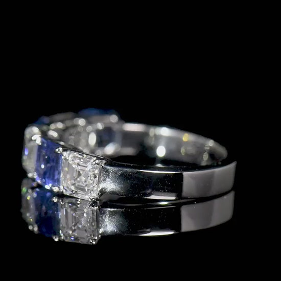 Natural Diamond & Sapphire Half Eternity Ring 18K White Gold, Asscher Cut, 3.13 Ct. TW