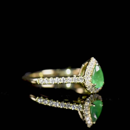 Natural Green Emerald Halo Ring 18K Yellow Gold, Pear Shape, 0.57 Ct. TW