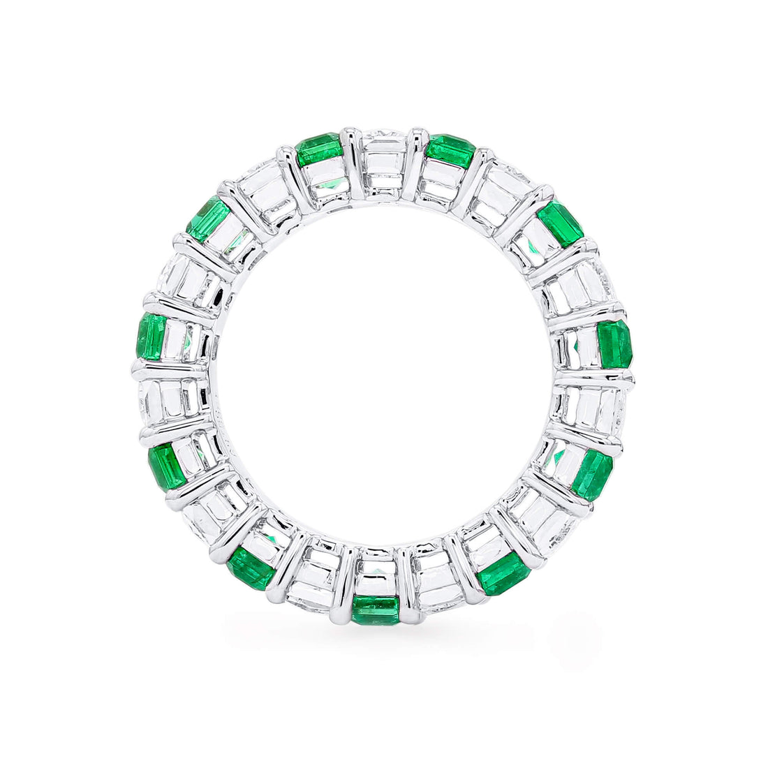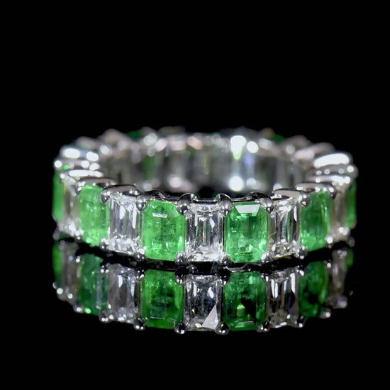 Natural Diamond and Green Colombian Emerald Eternity Ring 18K White Gold, Emerald Shape, 5.98 Ct. TW