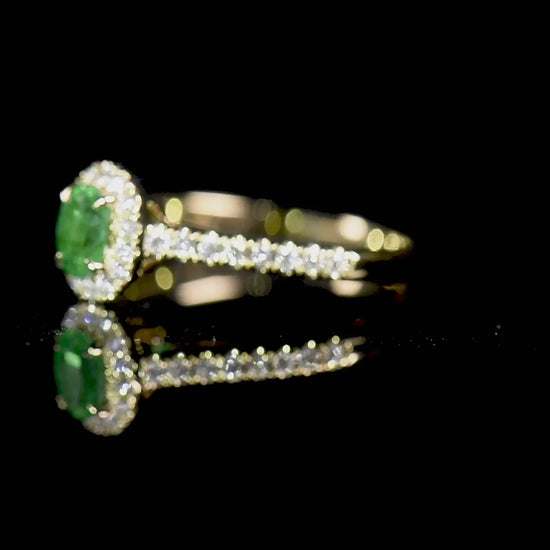 Natural Vivid Green Emerald Halo Ring 18K Yellow Gold, Oval Shape, 0.52 Ct. TW
