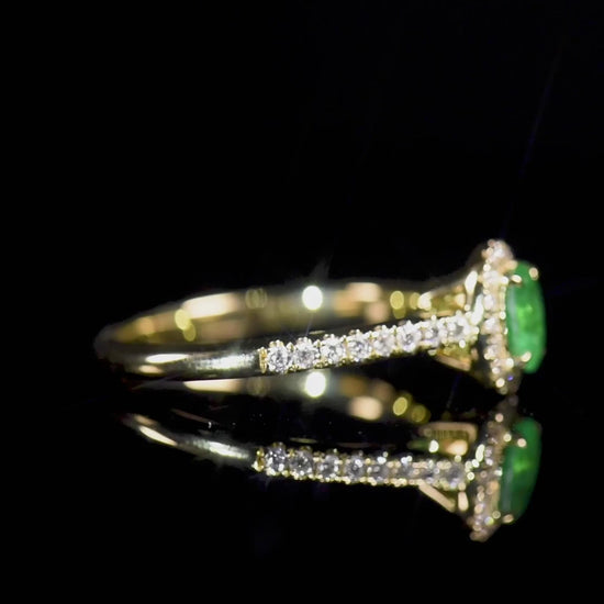 Natural Vivid Green Emerald Halo Ring 18K Yellow Gold, Oval Shape, 0.60 Ct. TW