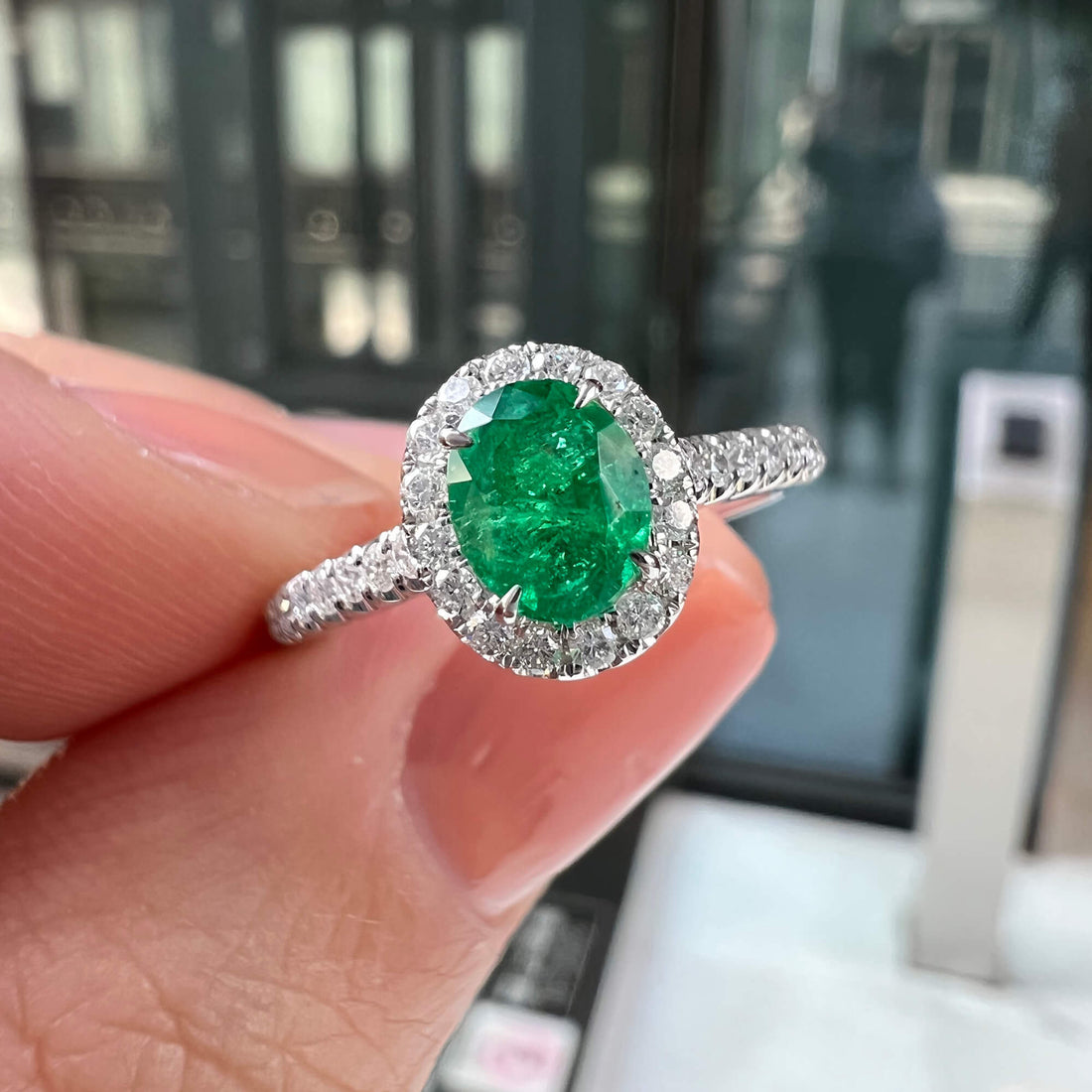 - Main Stone Weight of 0.62 Ct; featuring a vivid green oval emerald