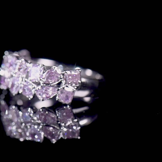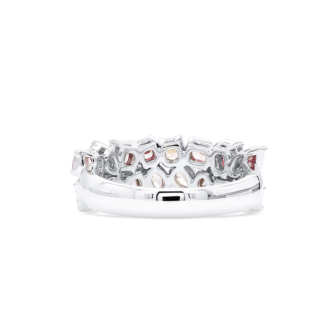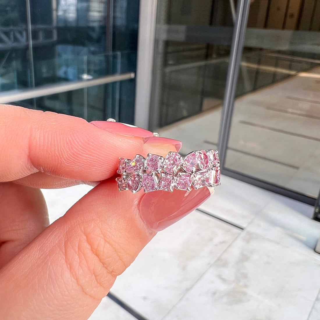 这枚戒指上的钻石重2.17克拉,形状各异,包括水滴形、枕形和椭圆形。钻石的颜色为淡彩粉,在彩钻中,这是一种柔和细腻的颜色。钻石镶嵌在18K白金上,与钻石柔和的粉红相得益彰。戒圈也由18K白金制成,设计简洁优雅。这枚戒指是一件令人惊艳的珍稀珠宝,既可以作为完美的订婚戒指,也可以作为一份特别的礼物送给那些热爱独特多彩珠宝的人。