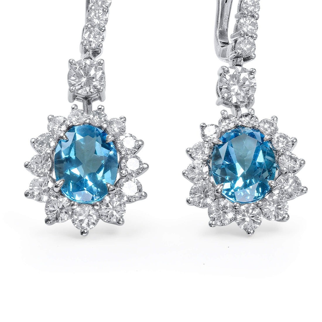 Natural Diamond and Blue Tourmaline Drop Earrings 18K White Gold, Oval Shape, 7.14 Ct. TW