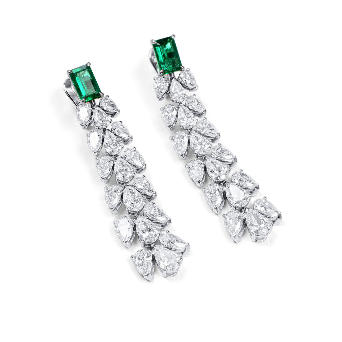 Natural Emerald And Diamond Drop Earrings, 18K White Gold, 11.55 Ct. TW
