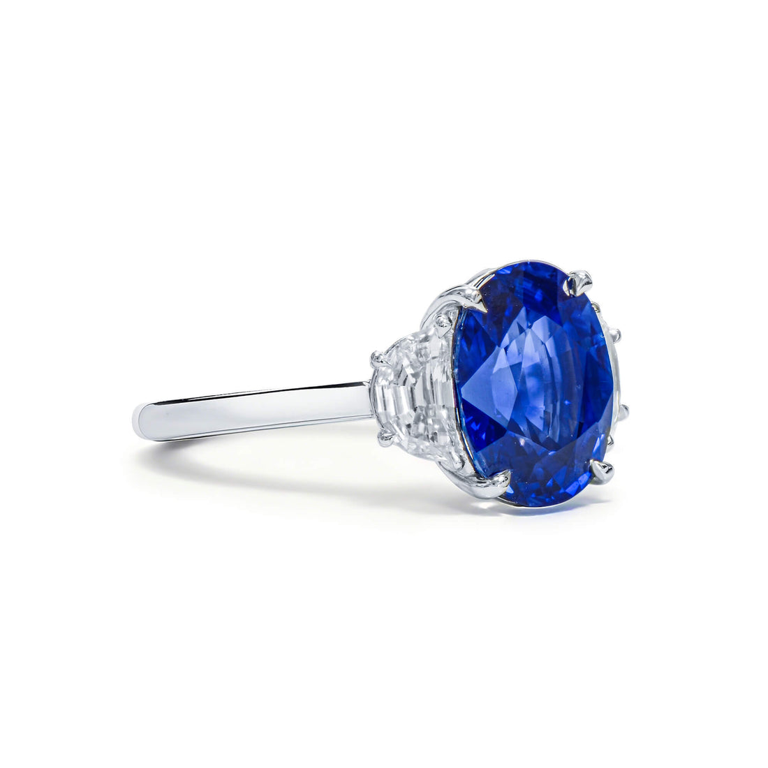 - 1 main stone of vivid blue sapphire (4.56 ct) and side stones weighting 0.55 ct