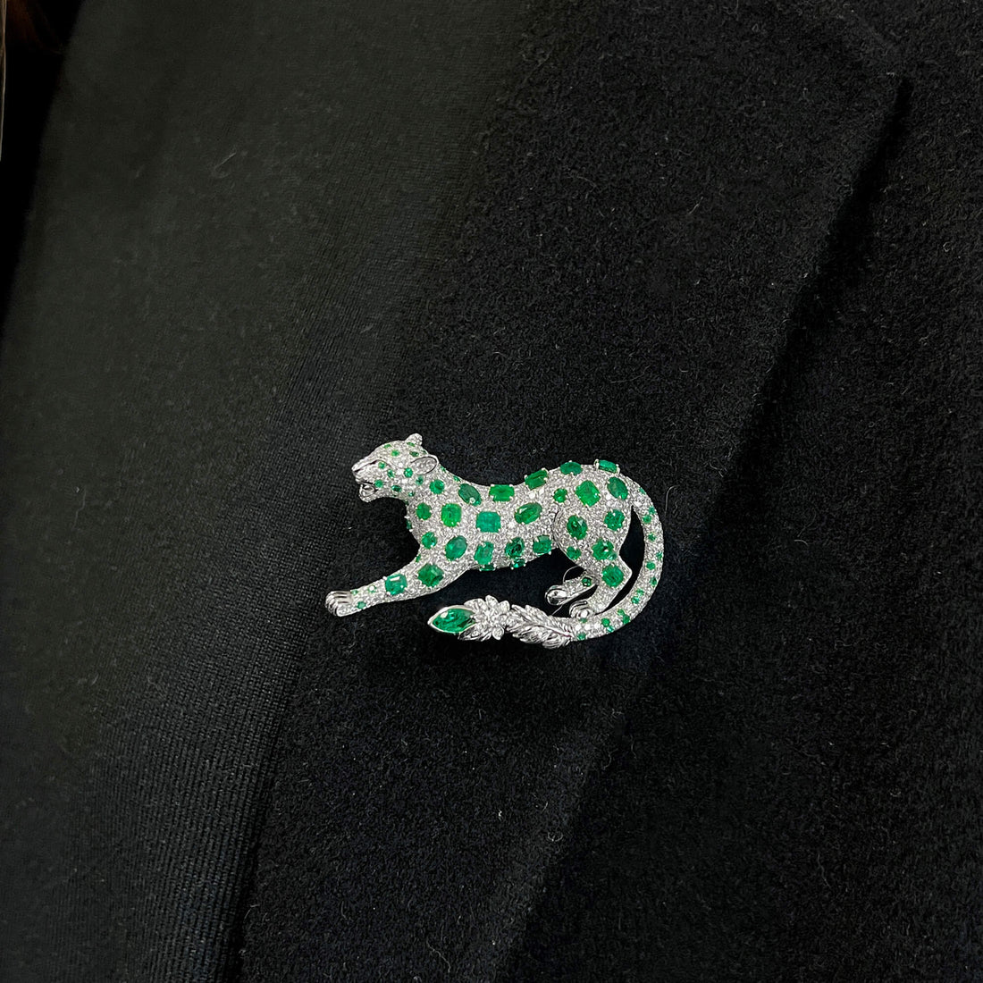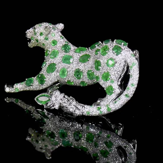 Natural Vivid Green Emerald And Diamond Brooch 14K White Gold, 7.85 Ct. TW